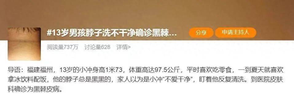 数据显示,肥胖型黑棘皮病最为常见。具体来说,有研究发现,正常体重、超重或肥胖的 7~19 岁群体中,分别有 3%、11% 以及 51% 的人患有黑棘皮病。对于将近 200 斤的新闻当事人,妥妥的是肥胖群体了,很容易中招黑棘皮病。